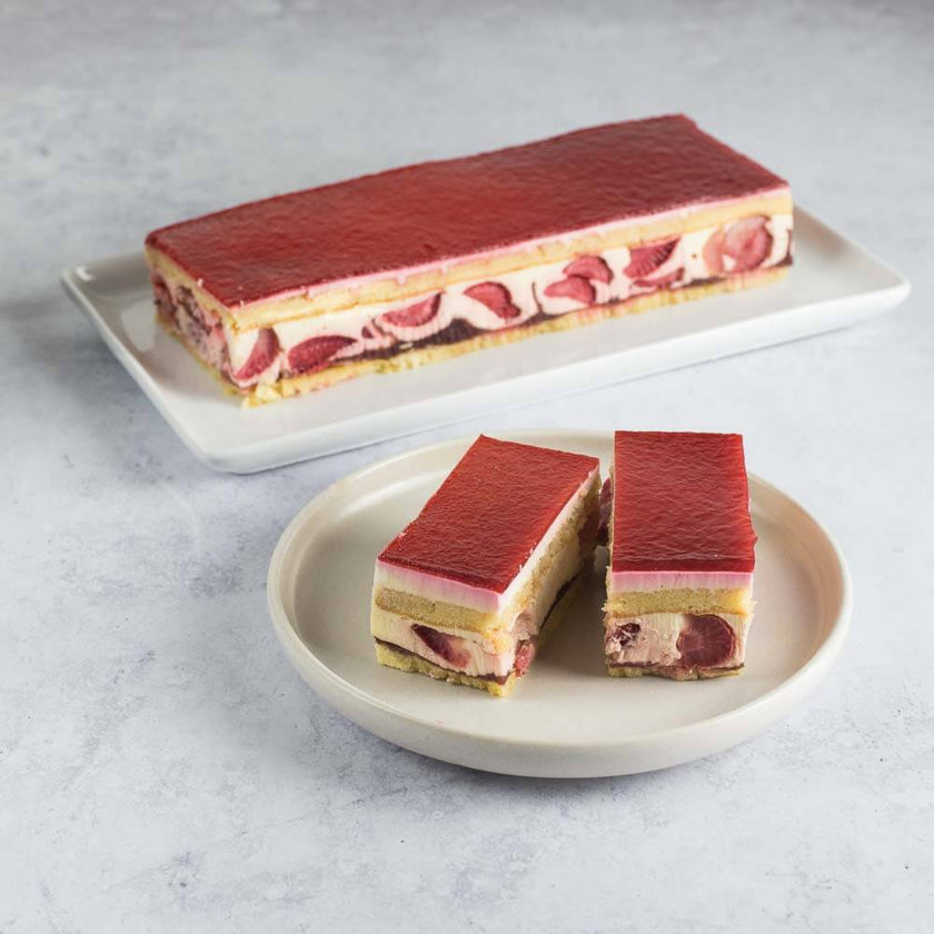 When compared to other strawberry-based cakes, such as the classic strawberry shortcake or sponge cake varieties, this strip cake offers a more mousse-forward experience. Unlike traditional cakes with heavier cream layers or dense sponge textures, this one leans toward a light and airy profile. This makes it an excellent option for those who enjoy fruit-based desserts without excessive richness.